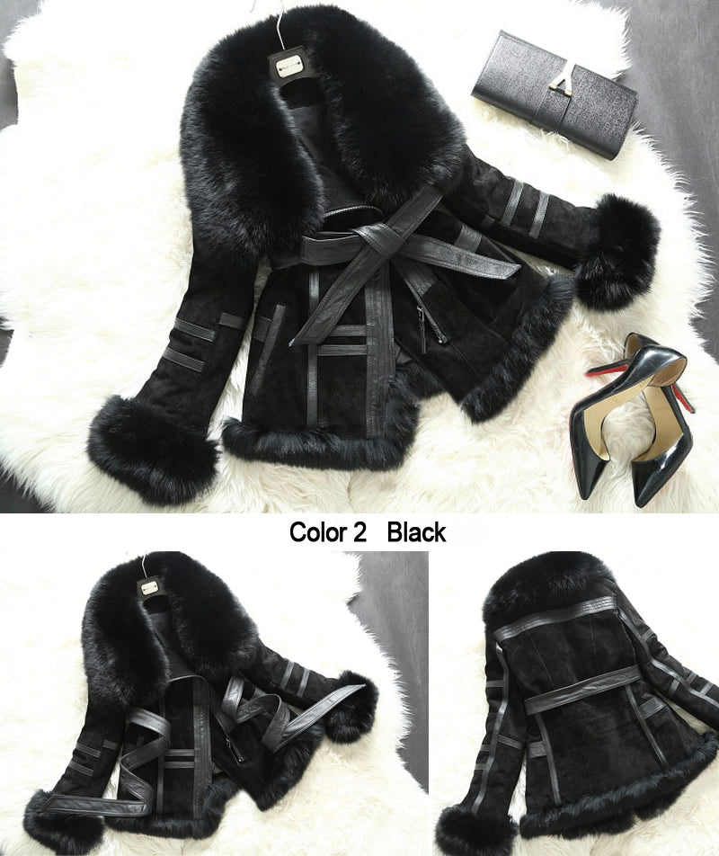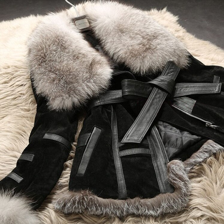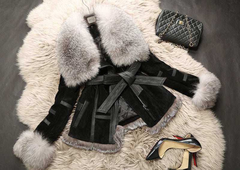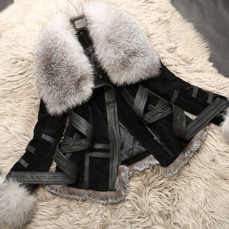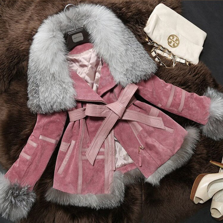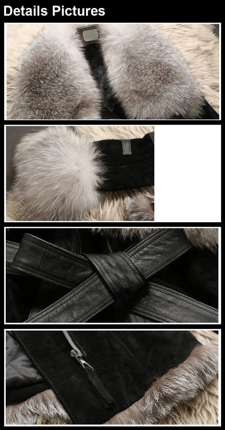 Genuine Leather Coat Full Pelt Fox Fur Collar Collar and Sleeve Cuff Jacket