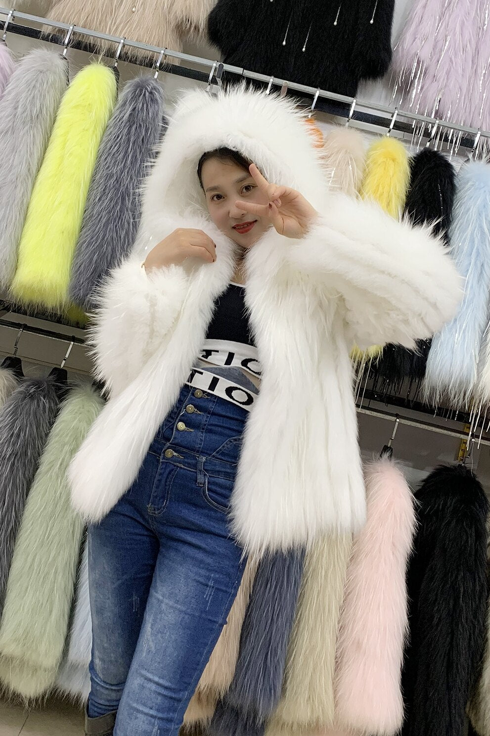 Women Stripe Hooded Medium Length White Raccoon Fur Coat 21120