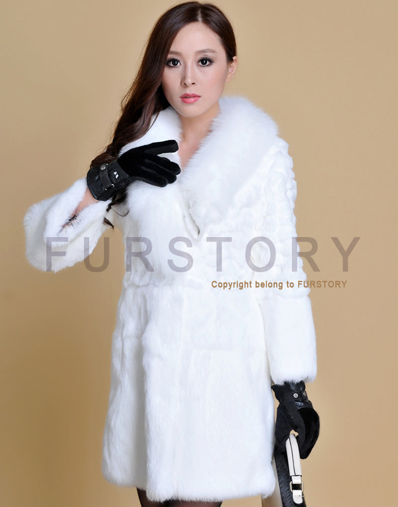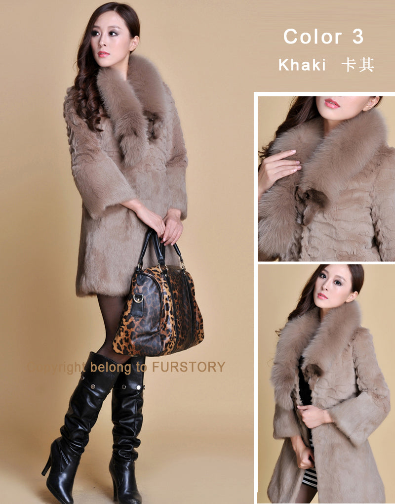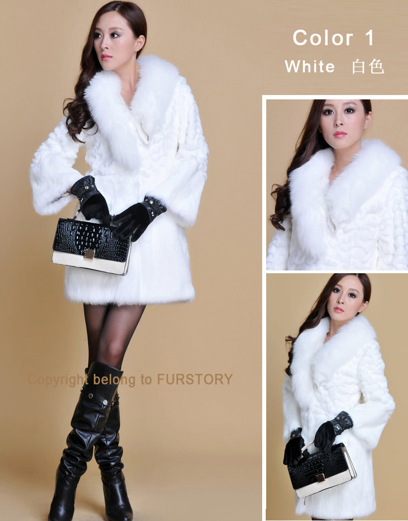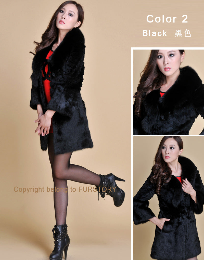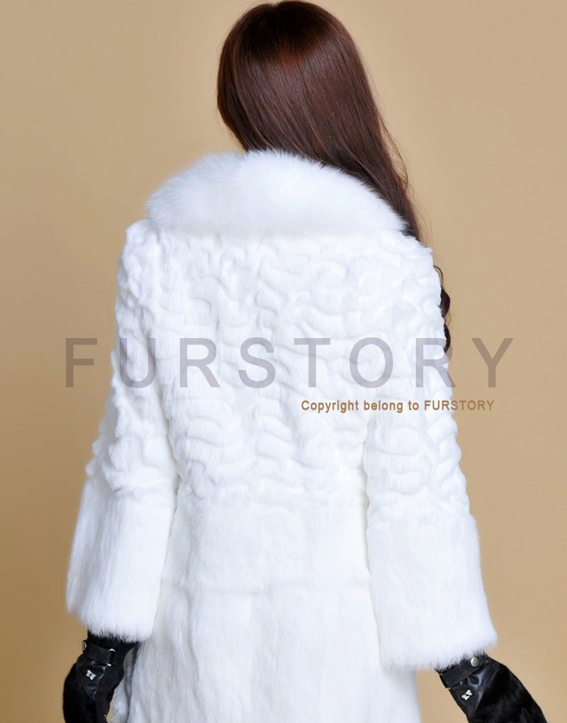Women's Long Real Rabbit Fur Coat with Fox Fur Collor Fur Story FS13070