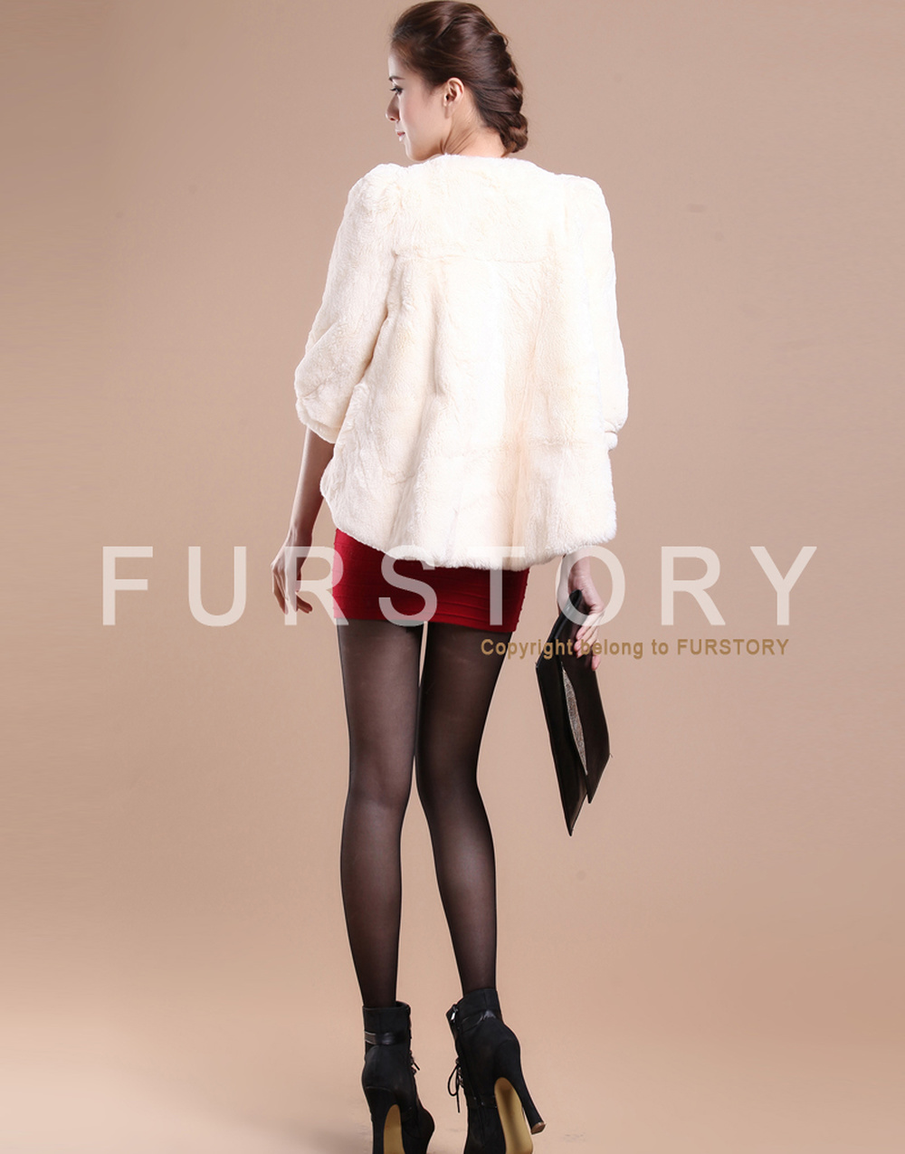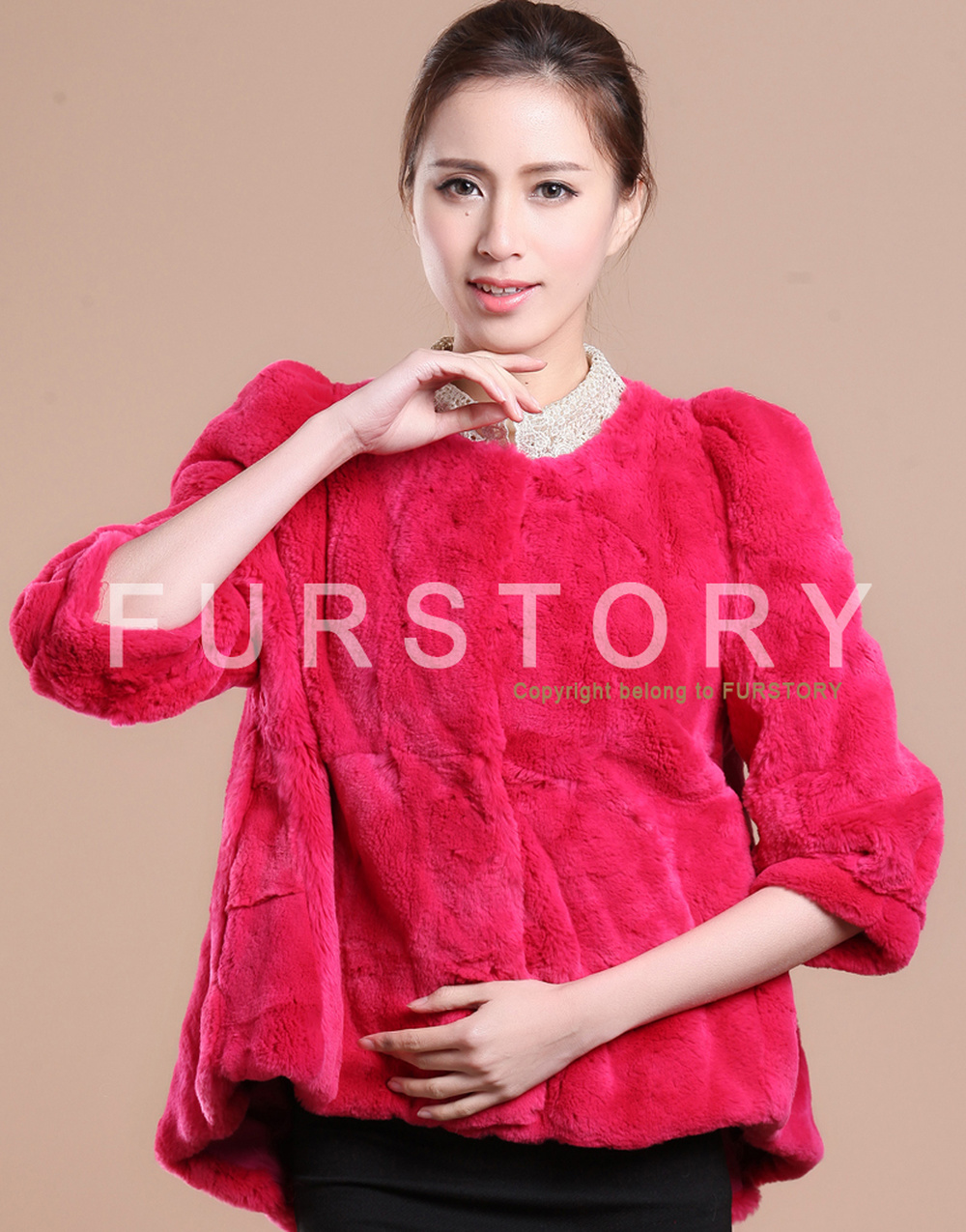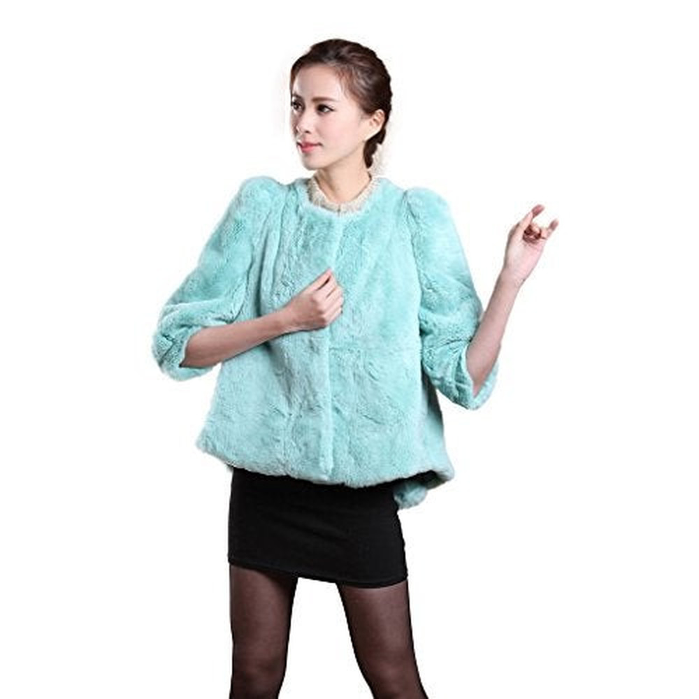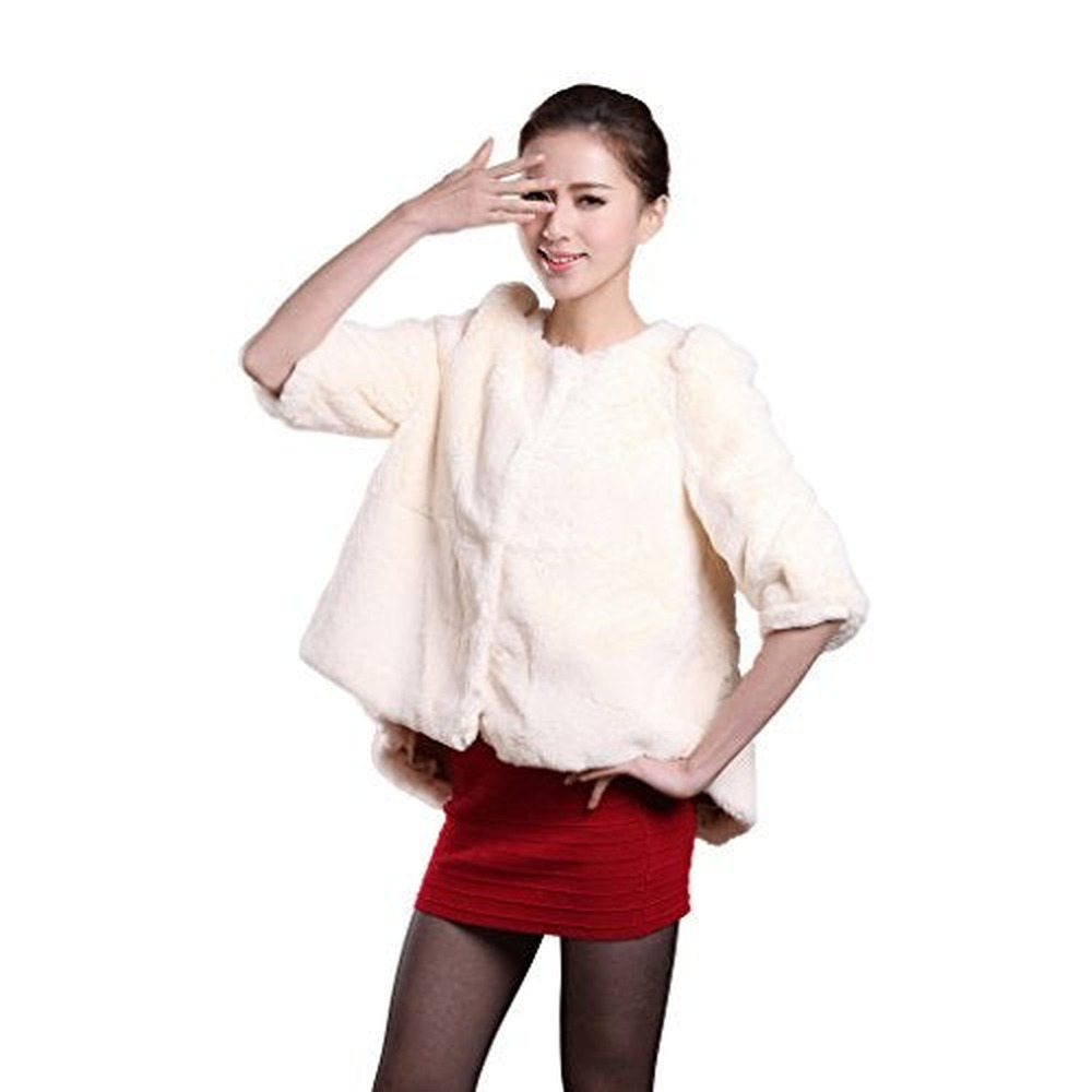Women's Natural Rex Rabbit Fur Coat with Big Skirt Hem Half Sleeve