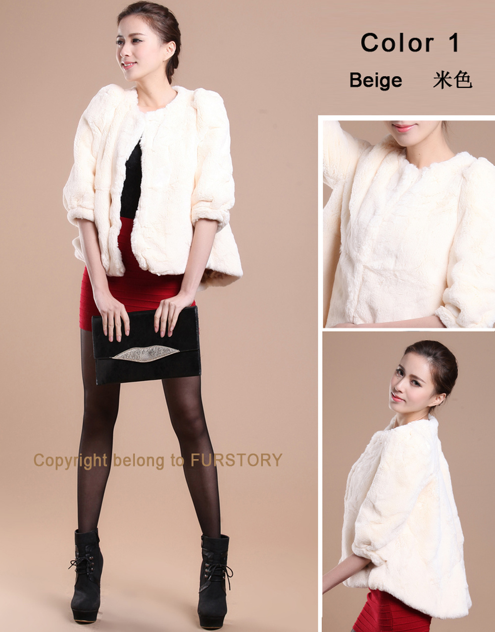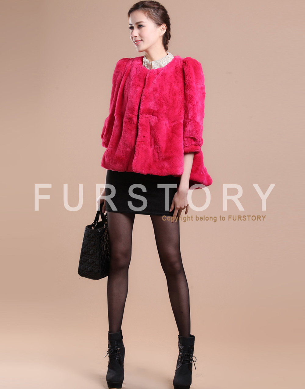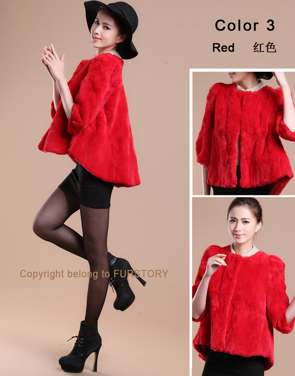 Women's Natural Rex Rabbit Fur Coat with Big Skirt Hem Half Sleeve