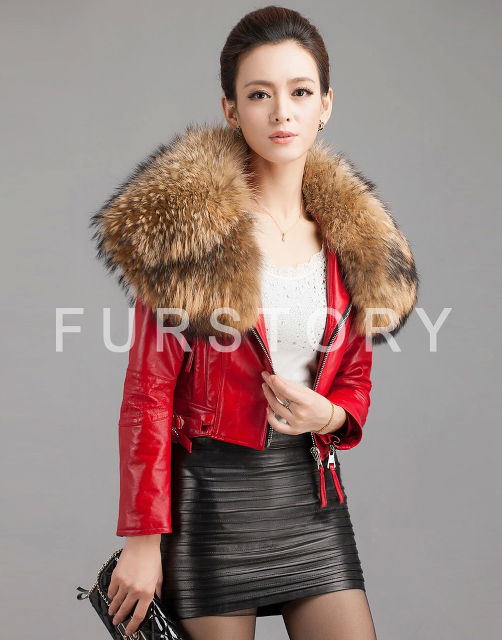 Women's Short Genuine Sheep Leather Coat with Raccoon Fur Collar