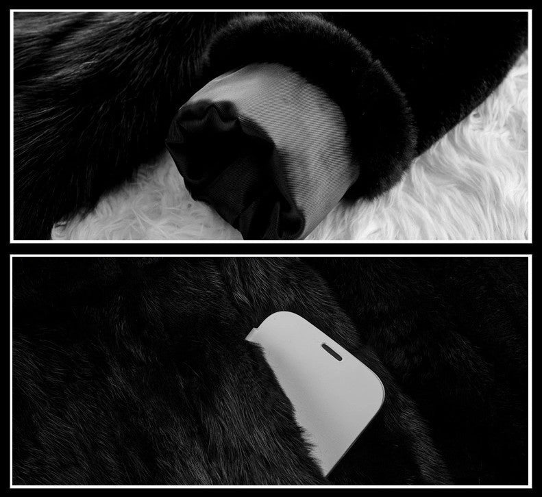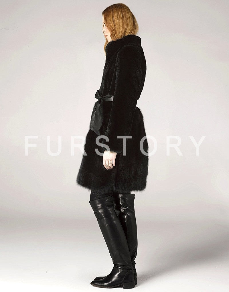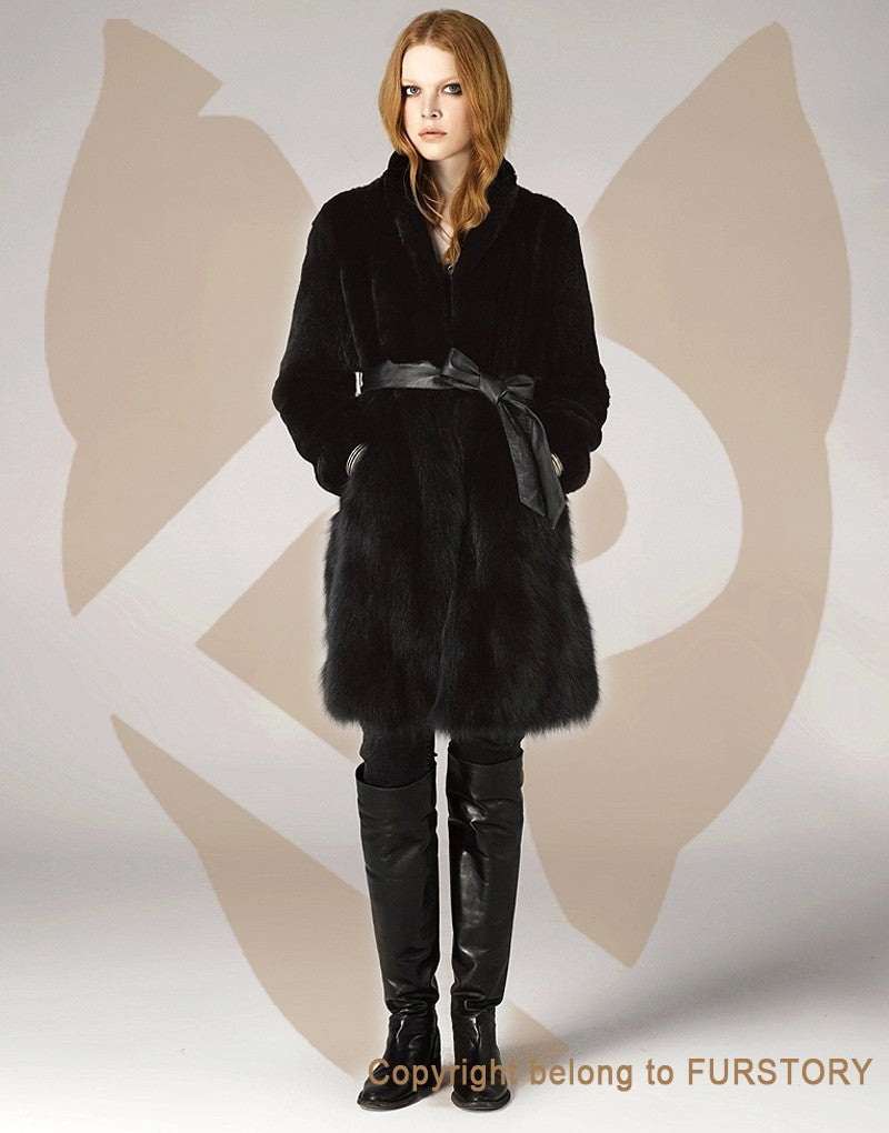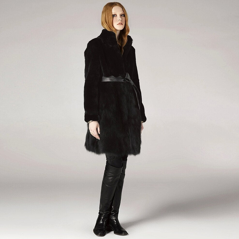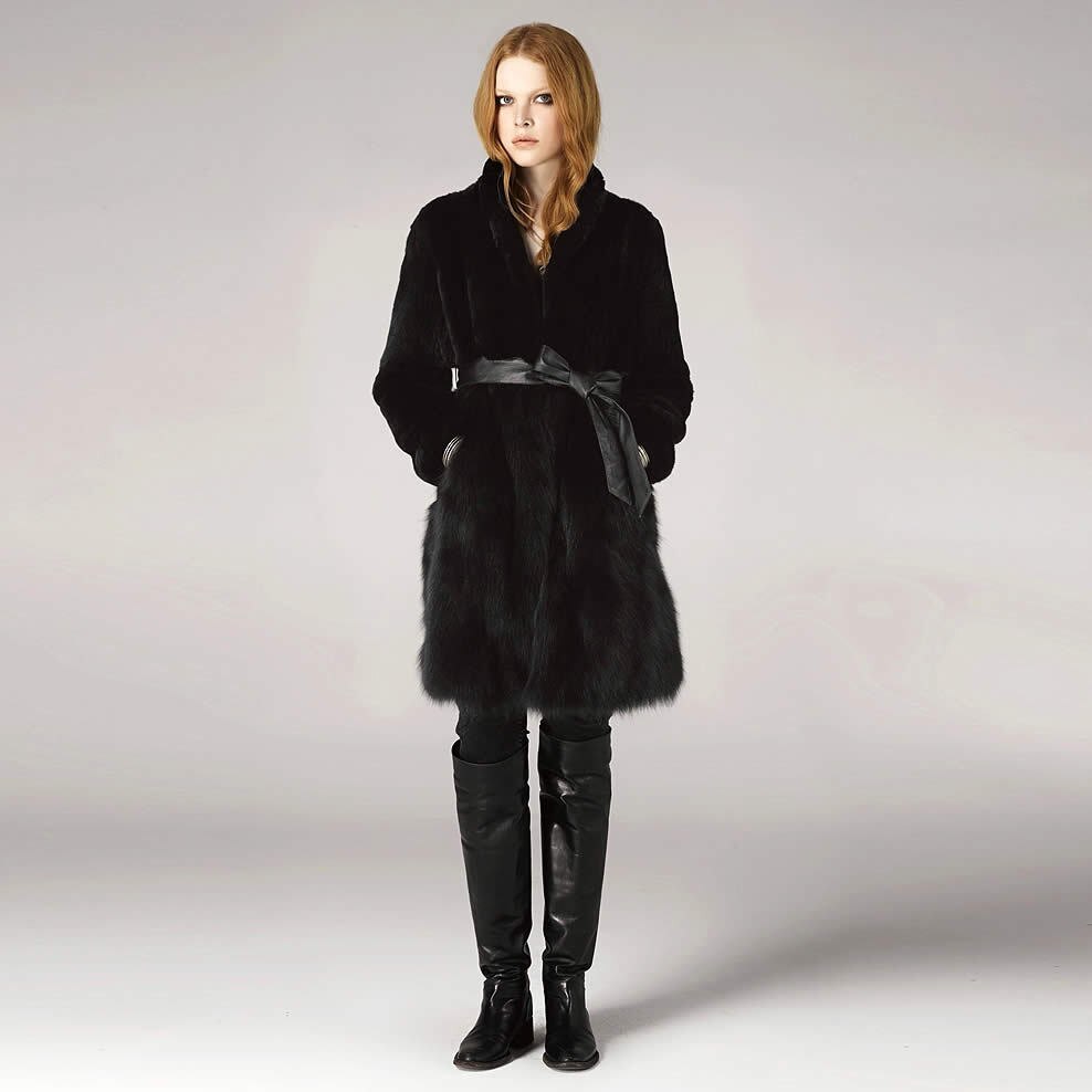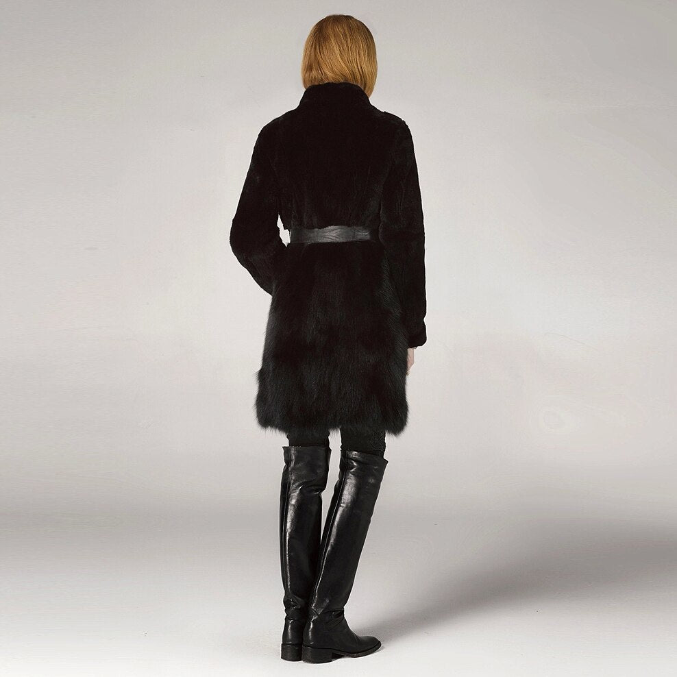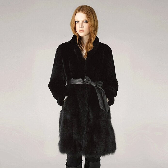 Natural Rabbit Fur Overcoats with Fox Fur Overcoat Belt Slim Winter Coat