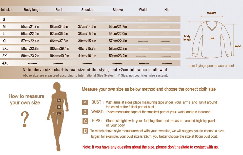2) To match above Style measurement with your own size, we will suggest you to choose a szie larger, for example, if your bust size is 92cm, you better choose the style size at 96cm bust.
