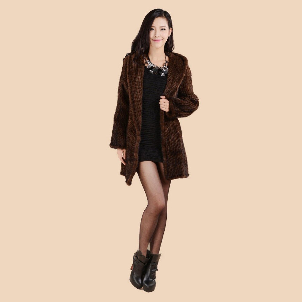 Women's Genuine Knitted Mink Fur Coat Hooded with Belt Long Real Fur Coat 15180