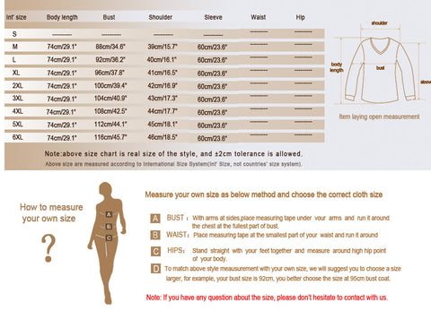 2) To match above Style measurement with your own size, we will suggest you to choose a szie larger, for example, if your bust size is 92cm, you better choose the style size at 96cm bust.