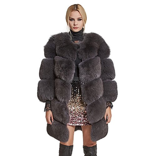 fur story Women's Long Fur Coat with Real Fox Fur Thick Warm Coat O Neck