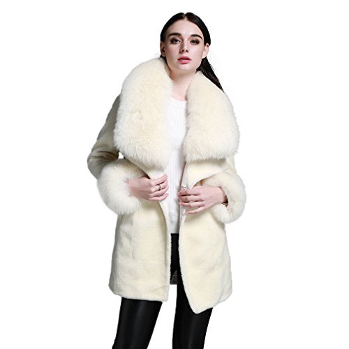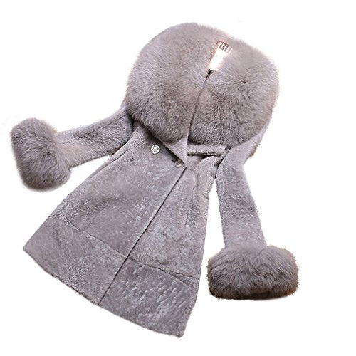 fur story Women's Long Real Lamb Fur Coat with Fox Fur Collar Thick Warm Coat Full Sleeve