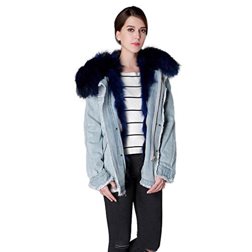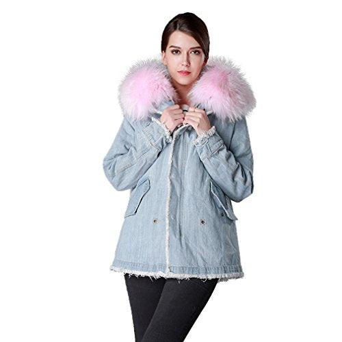 Fur Story Women's Real Fur Coat with Fox Fur Lining and Raccoon Fur Collar Full Sleeve