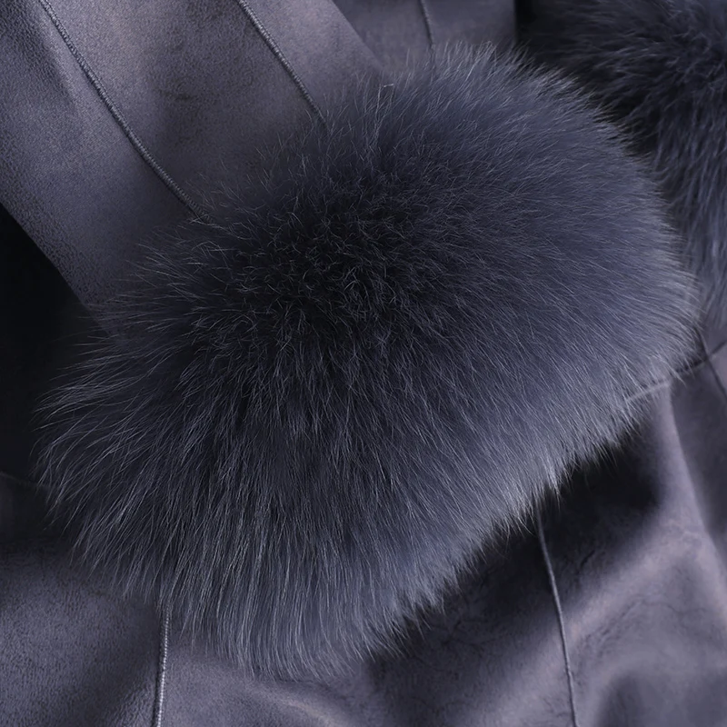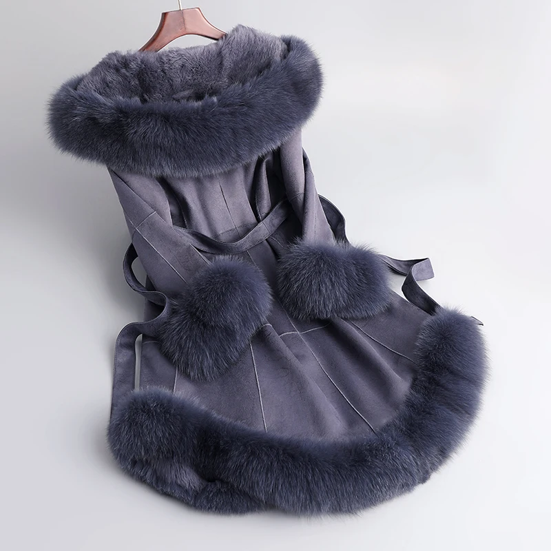 FS20155 Real Big Fox Fur Collar Rabbitskin Fur Women Long Coat With Belt Genuine Leather Coat Winter