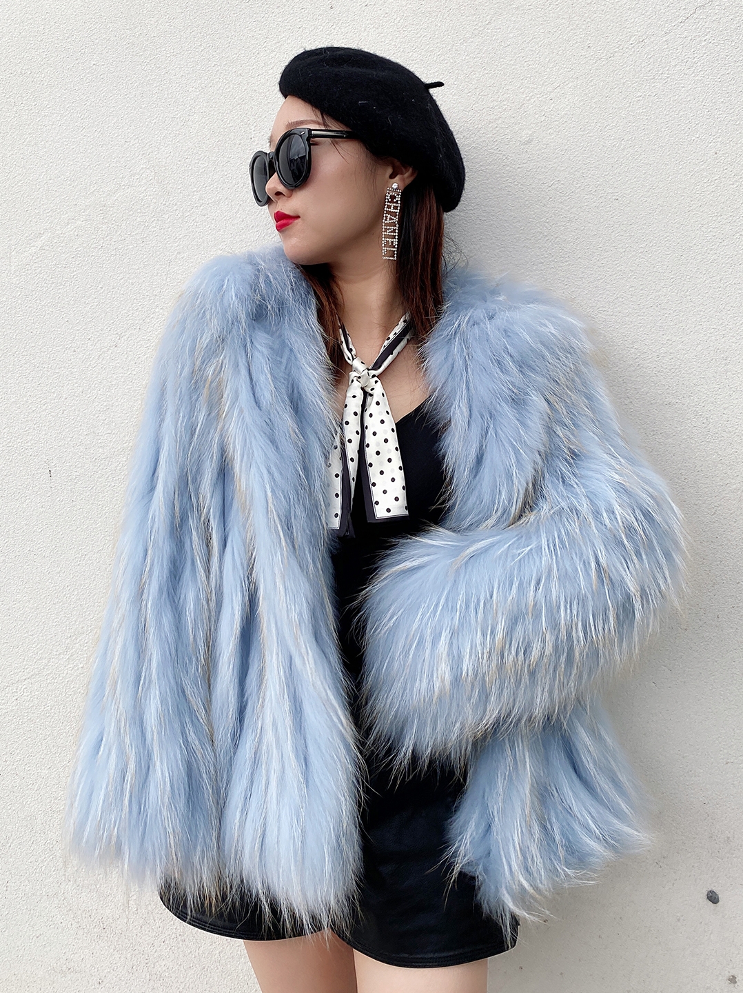 White Raccoon Dog Fur Stripe Woven Fur Coat Short Women's Slim Hood FS21110