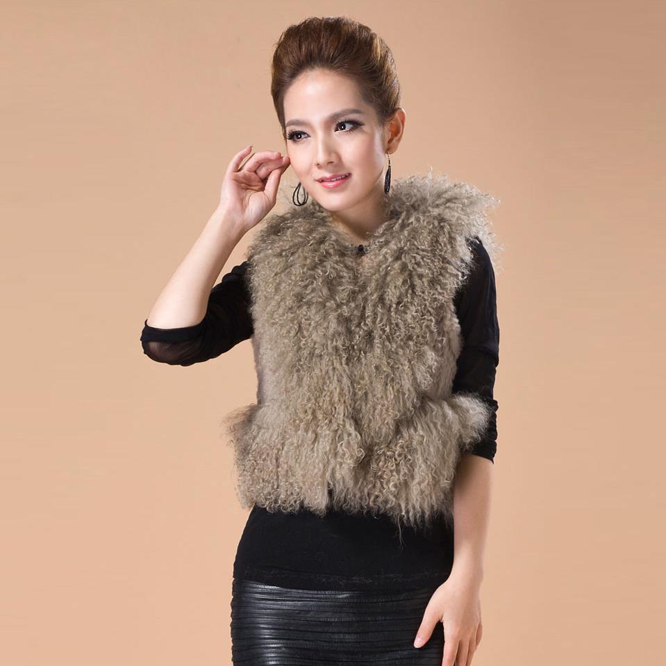 Genuine Tight Knitted Rabbit Fur Vest with Big Mongolia Lamb Fur Collar