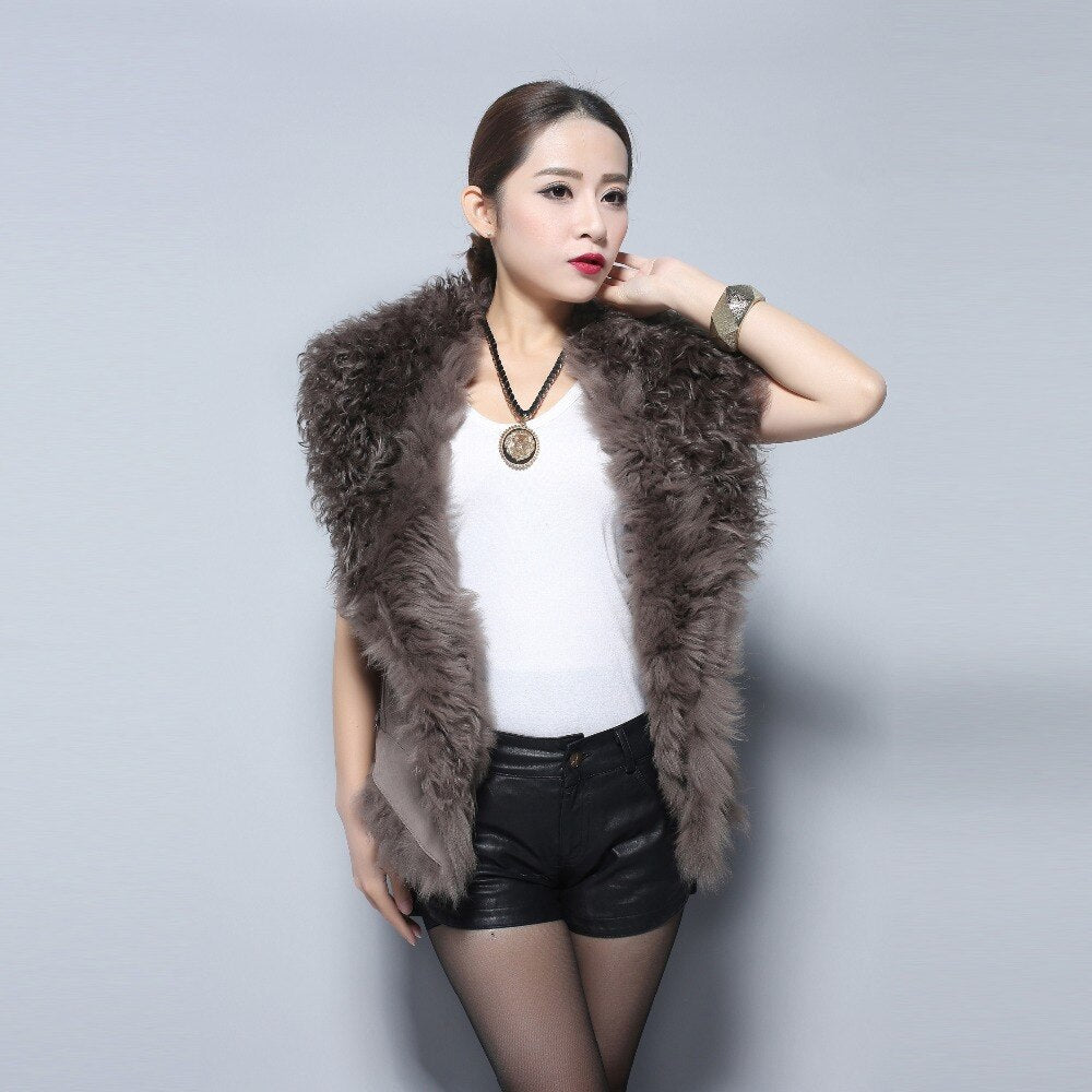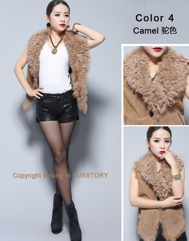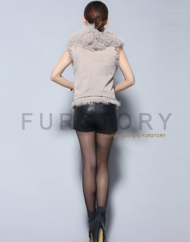 Women's Genuine Pig Leather Suede Vest with Real Lamb Fur Collar