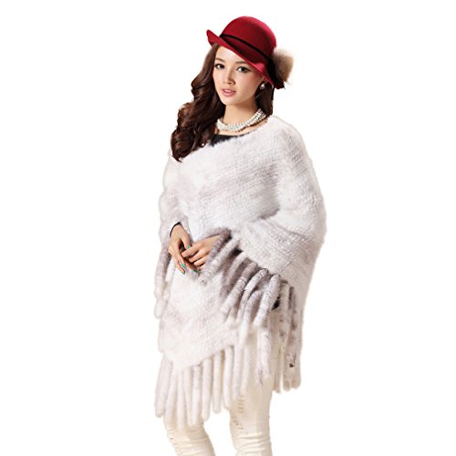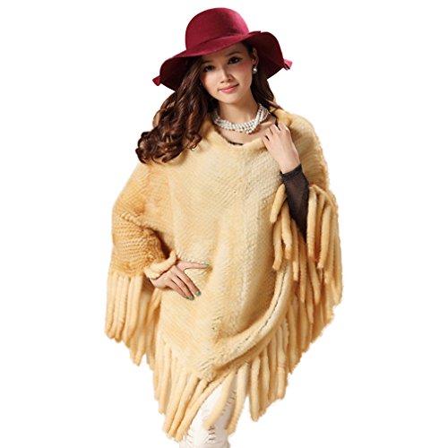 Fur Story Women's Knitted Long Fur Poncho with Real Mink Fur Thick Warm Pullover with Tassels
