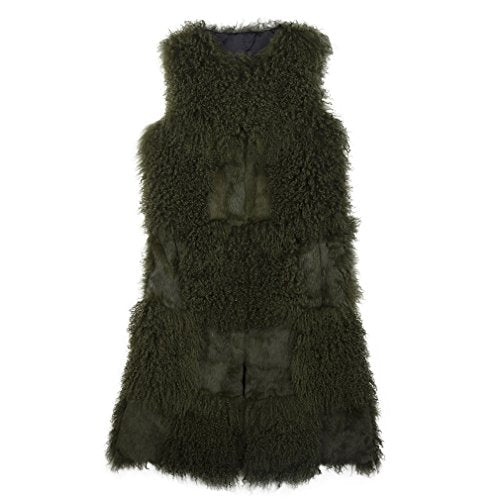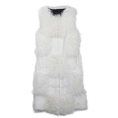 fur story Women's Long Real Mongolian Lamb Fur Vest with Rabbit Fur Sleeveless O Neck