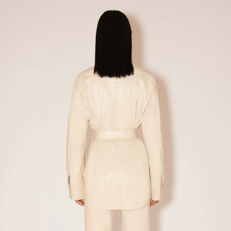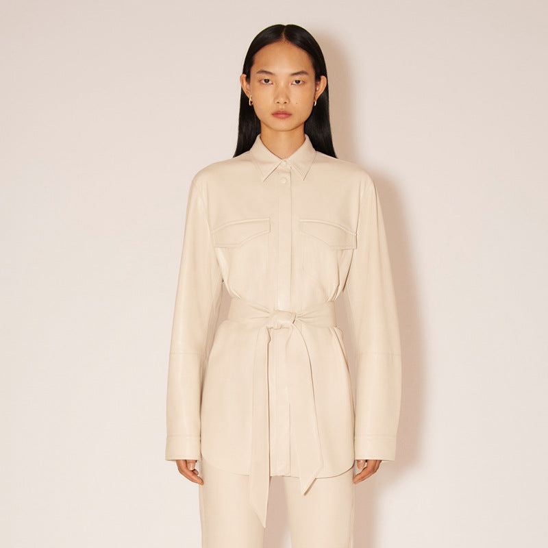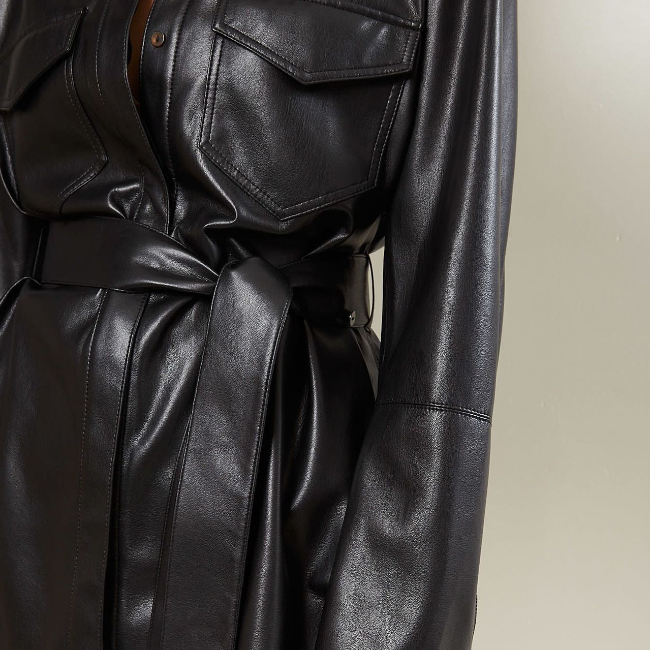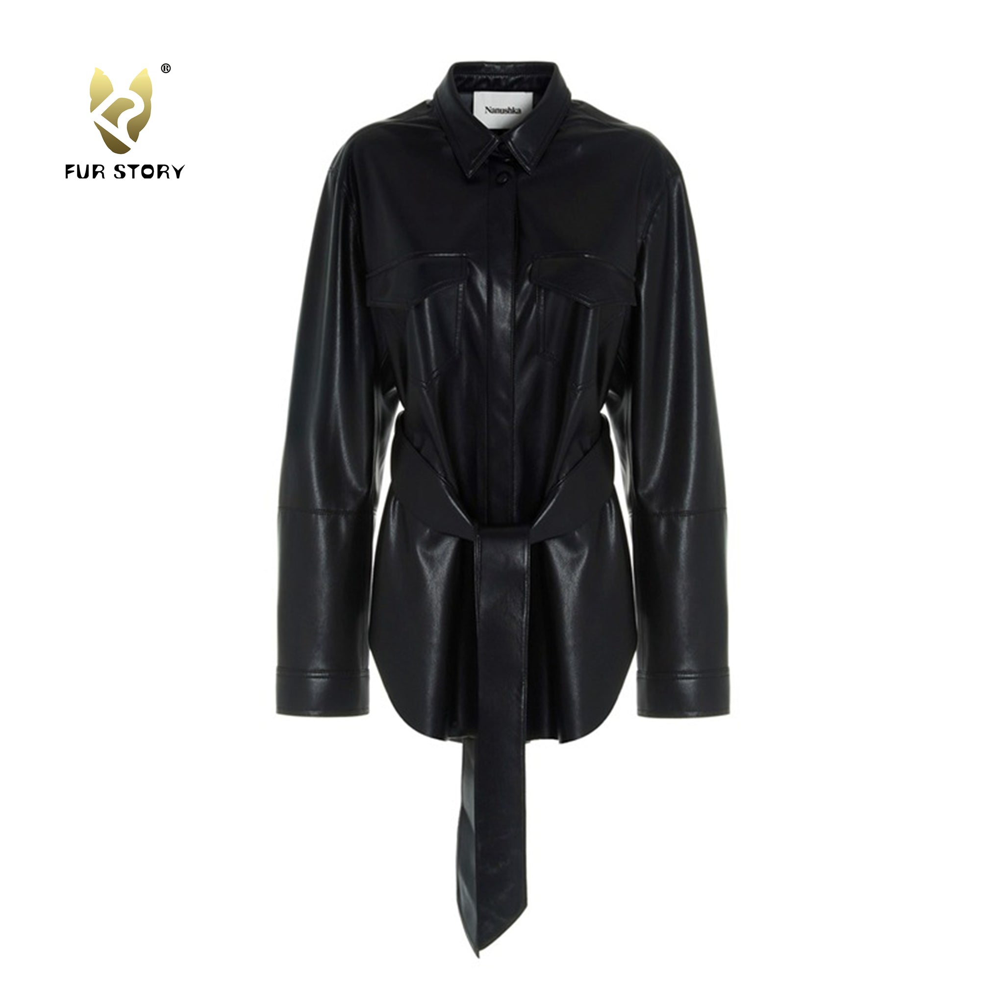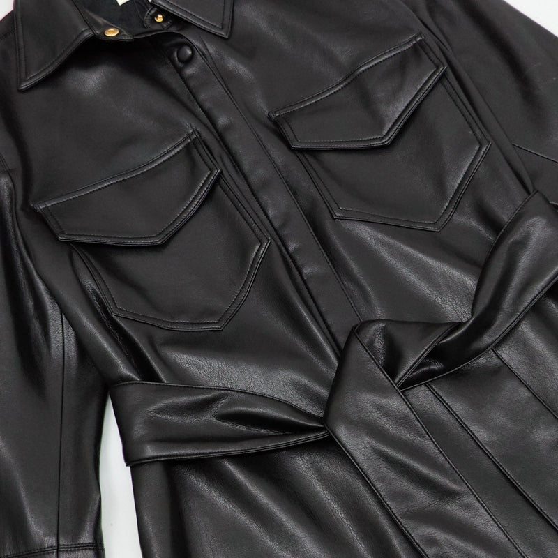 Long sleeves, turn down collar, solid color, hip length,with belt